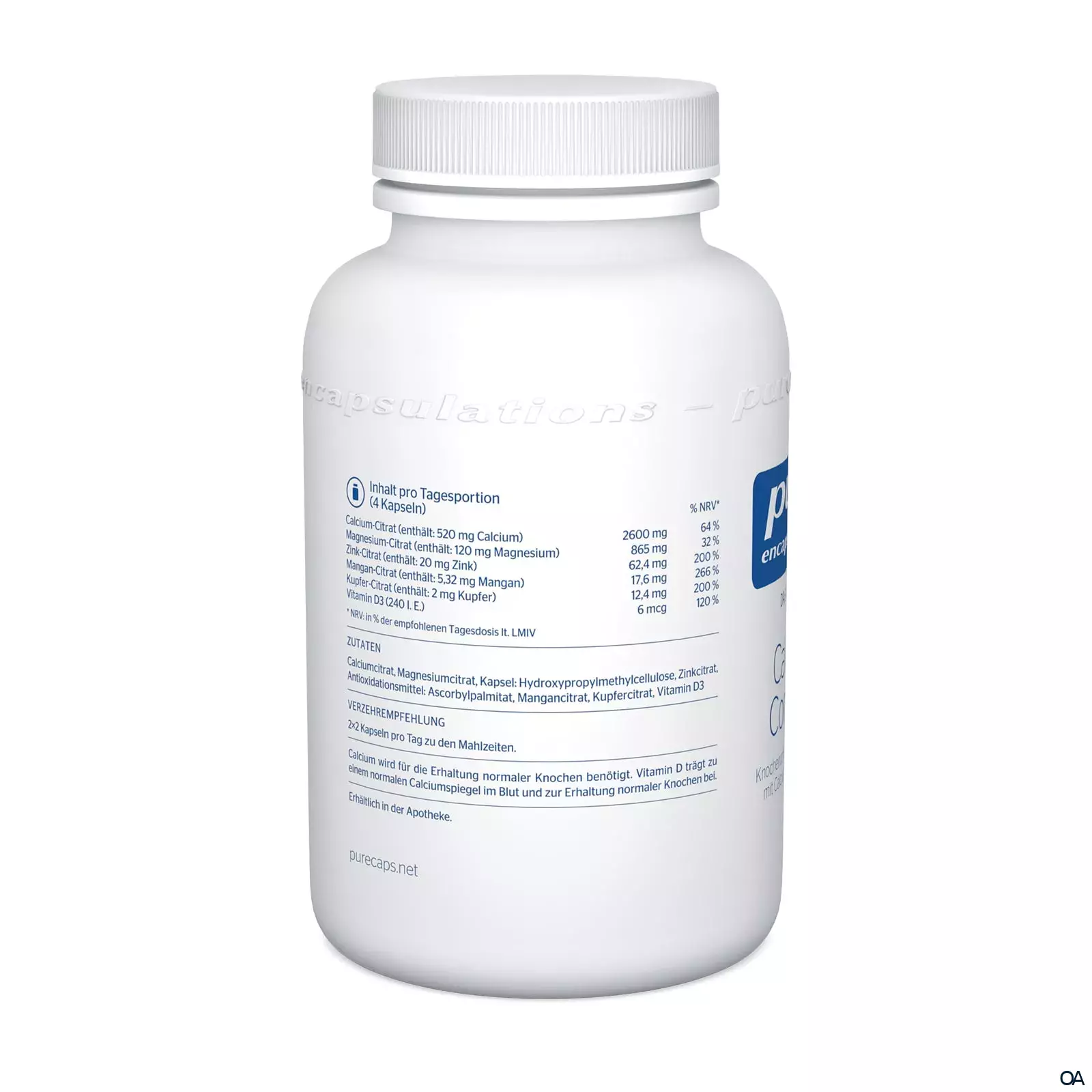 Inhalt pro Tagesportion (4 Kapseln) Calcium-Citrat (enthält: 520 mg Calcium) 2600 mg Magnesium-Citrat (enthält: 120 mg Magnesium) 865 mg Zink-Citrat (enthält: 20 mg Zink) 62,4 mg Mangan-Citrat (enthält: 5,32 mg Mangan) 17,6 mg Kupfer-Citrat (enthält: 2 mg Kupfer) 12,4 mg Vitamin D3 (240 I.E.) 6 mcg