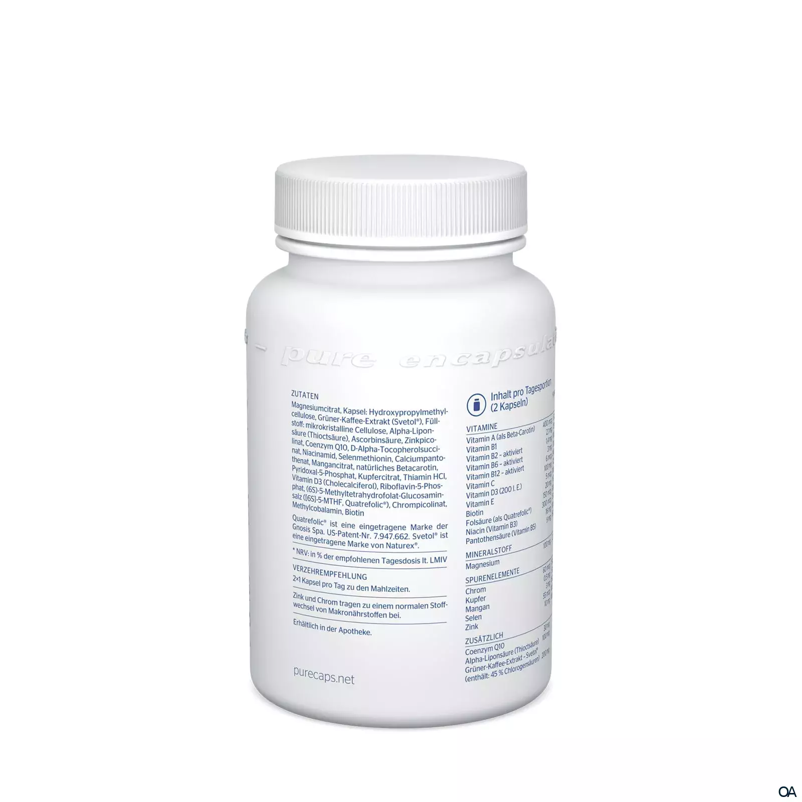 - Inhalt pro Tagesportion (2 Kapseln) %NRV*: Vitamin A (aus Betacarotin) 400 mcg 50 %, Vitamin B1 2,1 mg 191 %, Vitamin B2 – aktiviert 1,4 mg 100 %, Vitamin B6 – aktiviert 3 mg 214 %, Vitamin B12 – aktiviert 6 mcg 240 %, Vitamin C 100 mg 125 %, Vitamin D3 (200 I. E.) 5 mcg 100 %, Vitamin E 20 mg 167 %, Biotin 150 mcg 300 %, Calcium-L-Methylfolat (Metafolin®) 300 mcg 150 %, Niacin (Vitamin B3) 16 mg 100 %, Pantothensäure (Vitamin B5) 9 mg 150 %, Magnesium 100 mg 27 %, Chrom 60 mcg 150 %, Kupfer 0,5 mg 50 %, Mangan 3 mg 150 %, Selen 55 mcg 100 %, Zink 10 mg 100 %, Coenzym Q10 30 mg, Alpha-Liponsäure (Thioctsäure) 100 mg, Grüner Kaffee Extrakt – Svetol® (enthält: 90 mg Chlorogensäuren) 200 mg. Metafolin® ist eine eingetragene Marke der Merck KGaA, Darmstadt, Deutschland. Svetol® ist eine eingetragene Marke von Naturex®.