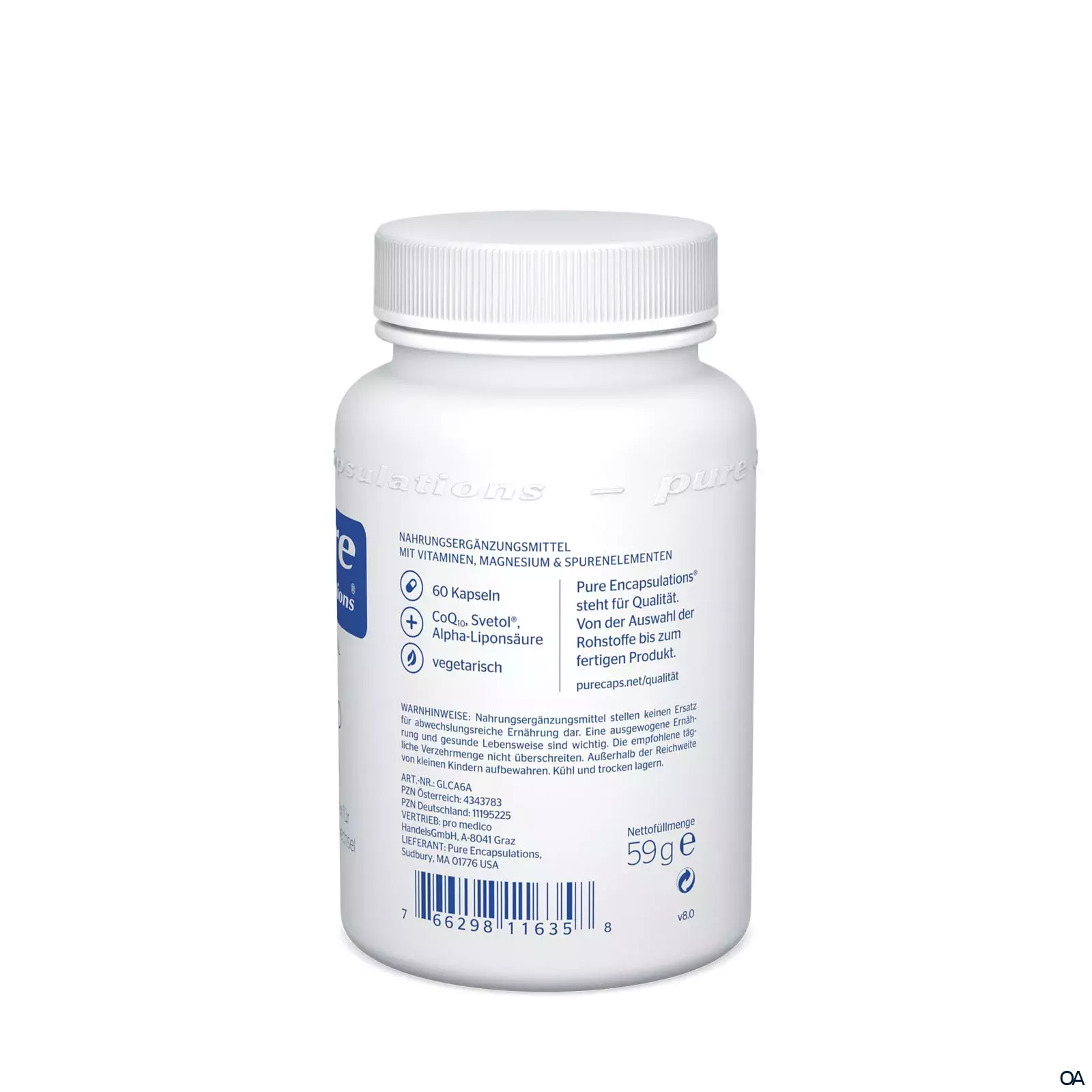- Zutaten: Magnesiumcitrat, Kapsel: Hydroxypropylmethylcellulose, grüner Kaffee-Extrakt (Svetol®), Füllstoff: mikrokristalline Cellulose, Alpha-Liponsäure (Thioctsäure), Ascorbinsäure, Zinkpicolinat, Coenzym Q10 (Ubichinon), D-alpha-Tocopherolsuccinat, Niacinamid, Selenmethionin, D-Calciumpantothenat, Mangancitrat, natürliches Beta-Carotin (Betanat®), Pyridoxal-5-Phosphat, Kupfercitrat, Thiamin HCl, Vitamin D3 (Cholecalciferol), Riboflavin-5-Phosphat, (6S)-5-Methyltetrahydrofolat-Glucosaminsalz ([6S]-5-MTHF, Quatrefolic®), Chrompicolinat, Biotin, Methylcobalamin (0,1 %)