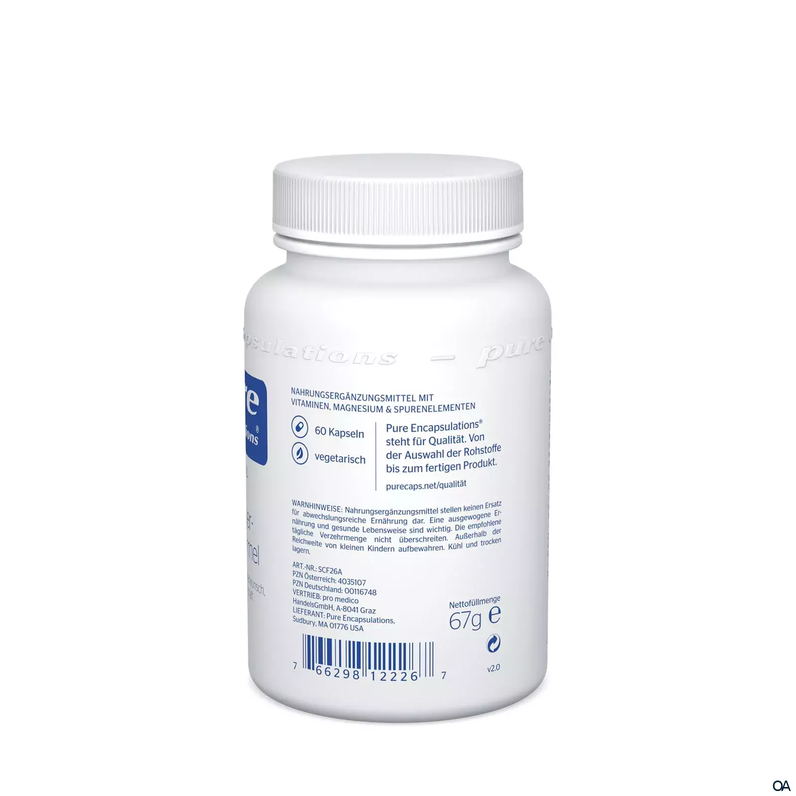 - Zutaten: Magnesiumcitrat, Kapsel: Hydroxypropylmethylcellulose, Eisencitrat, Ascorbinsäure, Zink picolinat, L-Leucin, Niacinamid, L-Isoleucin, L-Valin, Selenmethionin, D-alpha-Tocopherolsuccinat, Calciumpantothenat, Füllstoff: mikrokristalline Cellulose, Kaliumiodid, Vitamin D3, natürl. Betacarotin (Betanat®), Riboflavin-5-Phosphat, Pyridoxal-5-Phosphat, Thiamin HCl, (6S)-5-Methyltetrahydrofolat- Glucosaminsalz ((6S)-5-MTHF, Quatrefolic®), Biotin, Methylcobalamin