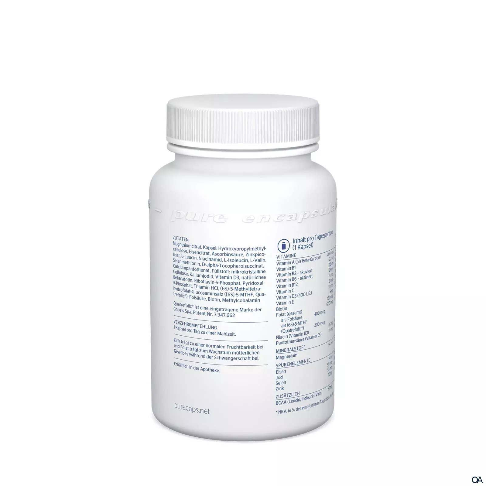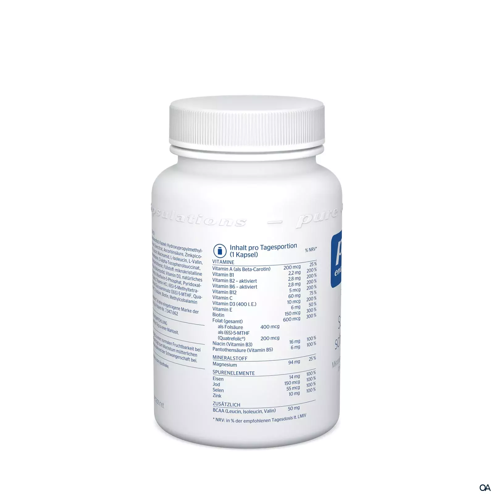 - Inhalt pro Tagesportion (1 Kapsel) Vitamine Vitamin A (als Beta-Carotin) 200 mcg Vitamin B1 2,2 mg Vitamin B2 – aktiviert 2,8 mg Vitamin B6 – aktiviert 2,8 mg Vitamin B12 5 mcg Vitamin C 60 mg Vitamin D3 (400 I.E.) 10 mcg Vitamin E 6 mg Biotin 150 mcg Folat (gesamt) als Folsäure400 mcg als (6S)-5-MTHF (Quatrefolic®)200 mcg 600 mcg Niacin (Vitamin B3) 16 mg Pantothensäure (Vitamin B5) 6 mg Mineralstoff Magnesium 94 mg Spurenelemente Eisen 14 mg Jod 150 mcg Selen 55 mcg Zink 10 mg Zusätzlich BCAA (Leucin, Isoleucin, Valin) 50 mg