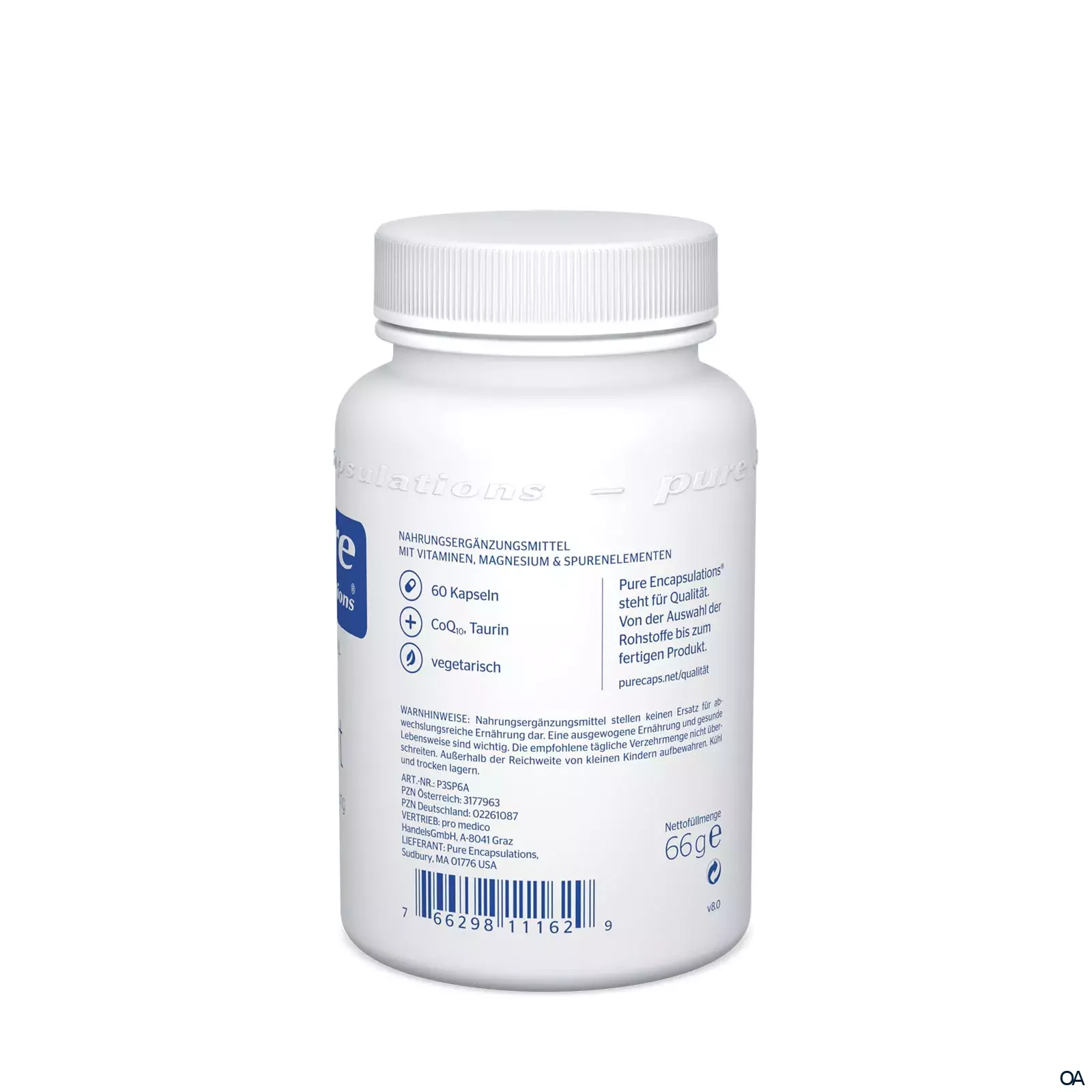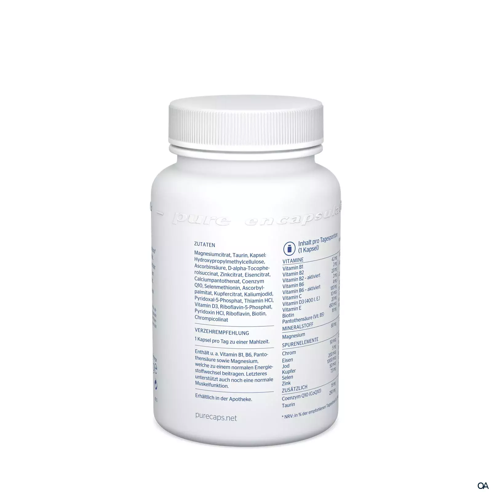 Zutaten: Magnesiumcitrat, Taurin, Kapsel: Hydroxypropylmethylcellu-lose, Ascorbinsäure, D-alpha-Tocophe rolsuccinat, Zinkcitrat, Eisencitrat, Calciumpantothenat, Coenzym Q10, Selenmethionin, Ascorbyl palmitat, Kupfercitrat, Kaliumjodid, Pyridoxal-5-Phosphat, Thiamin HCl, Vitamin D3, Riboflavin-5-Phosphat, Pyridoxin HCl, Riboflavin, Biotin, Chrompicolinat
