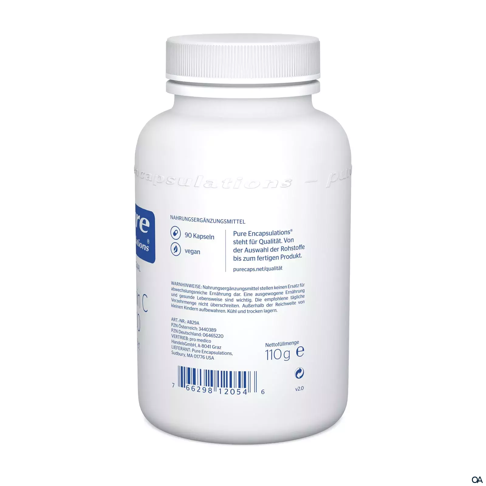 Als magenschonende Version des Mikronährstoffs ist Vitamin C gepuffert von Pure Encapsulations an die basischen Mineralstoffe Kalium, Magnesium und Calcium gebunden. Weil Vitamin C aufgrund des niedrigen pH-Werts bei empfindlicher Verdauung möglicherweise schlecht vertragen wird, schafft diese Kombination ein Gleichgewicht. Denn die Säurebelastung für den Magen wird dadurch reduziert und die gepufferte Variante ist somit besonders verträglich, so dass die Anwendung auch für sensible Menschen geeignet ist.