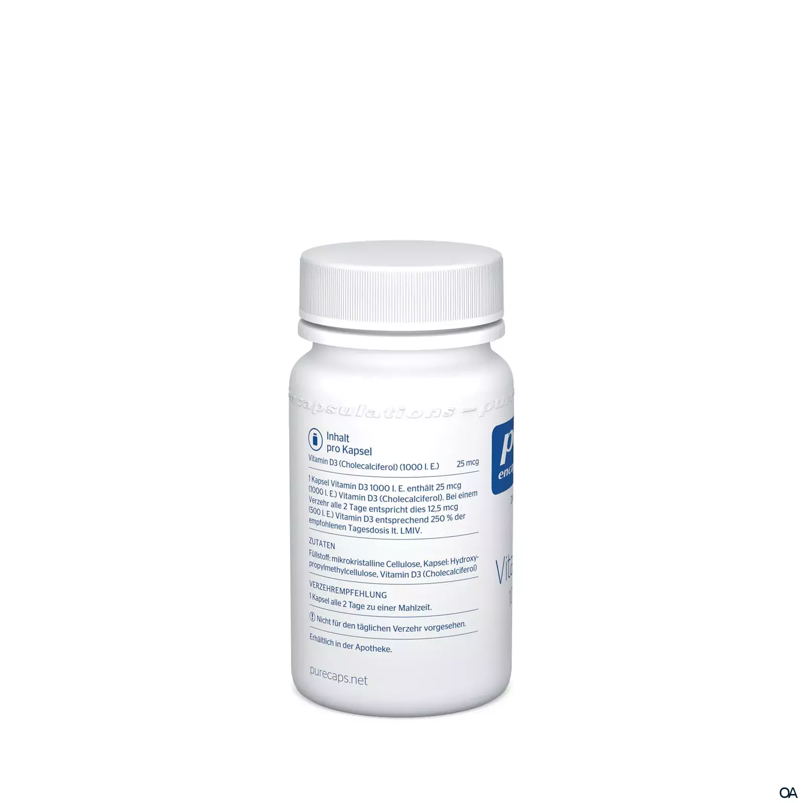 1 Kapsel Vitamin D3 1000 I.E. enthält 25 mcg (1000 I.E.) Vitamin D3 (Cholecalciferol). Bei einem Verzehr alle 2 Tage entspricht dies 12,5 mcg (500 I.E.) Vitamin D3 entsprechend 250% der empfohlenen Tagesdosis lt. LMIV
