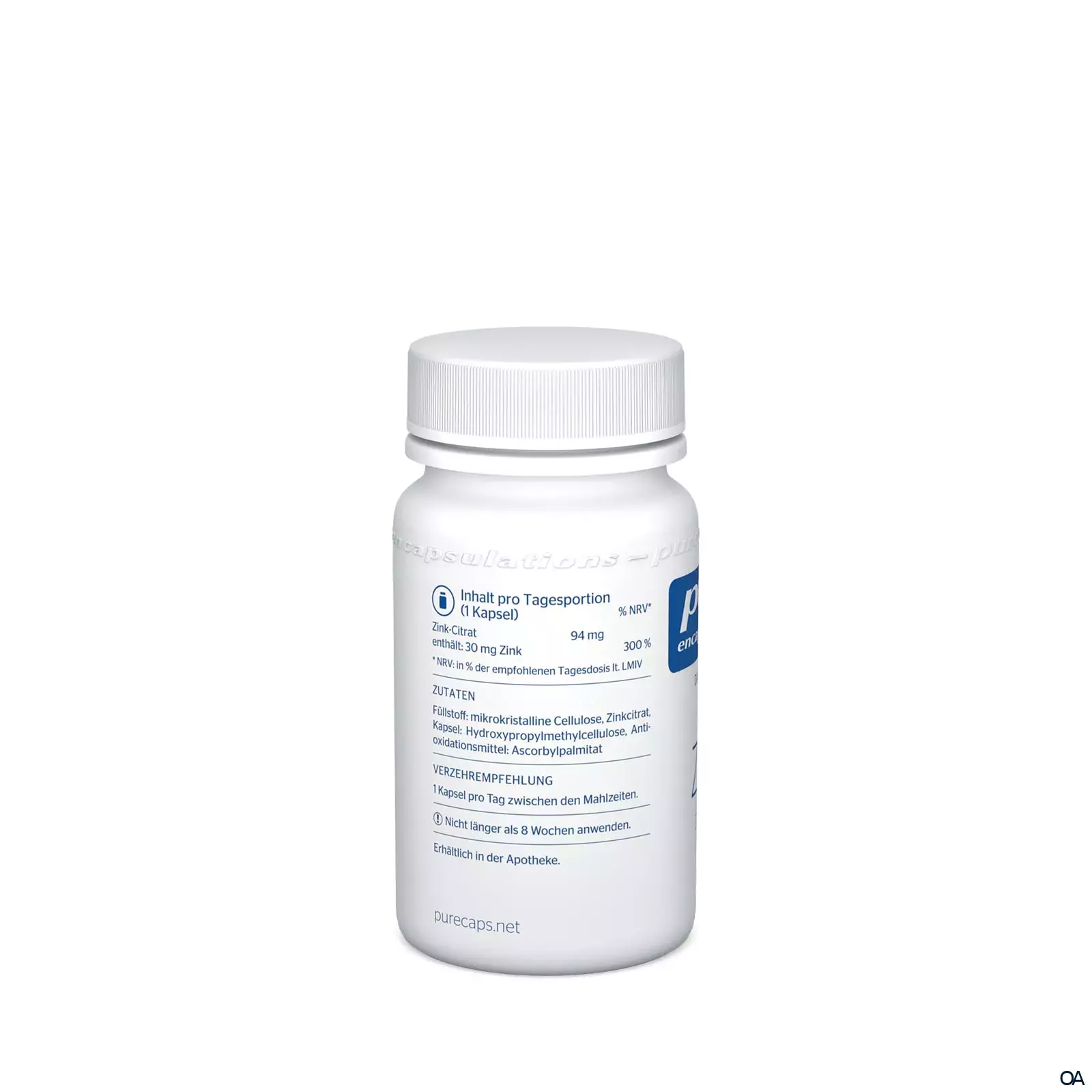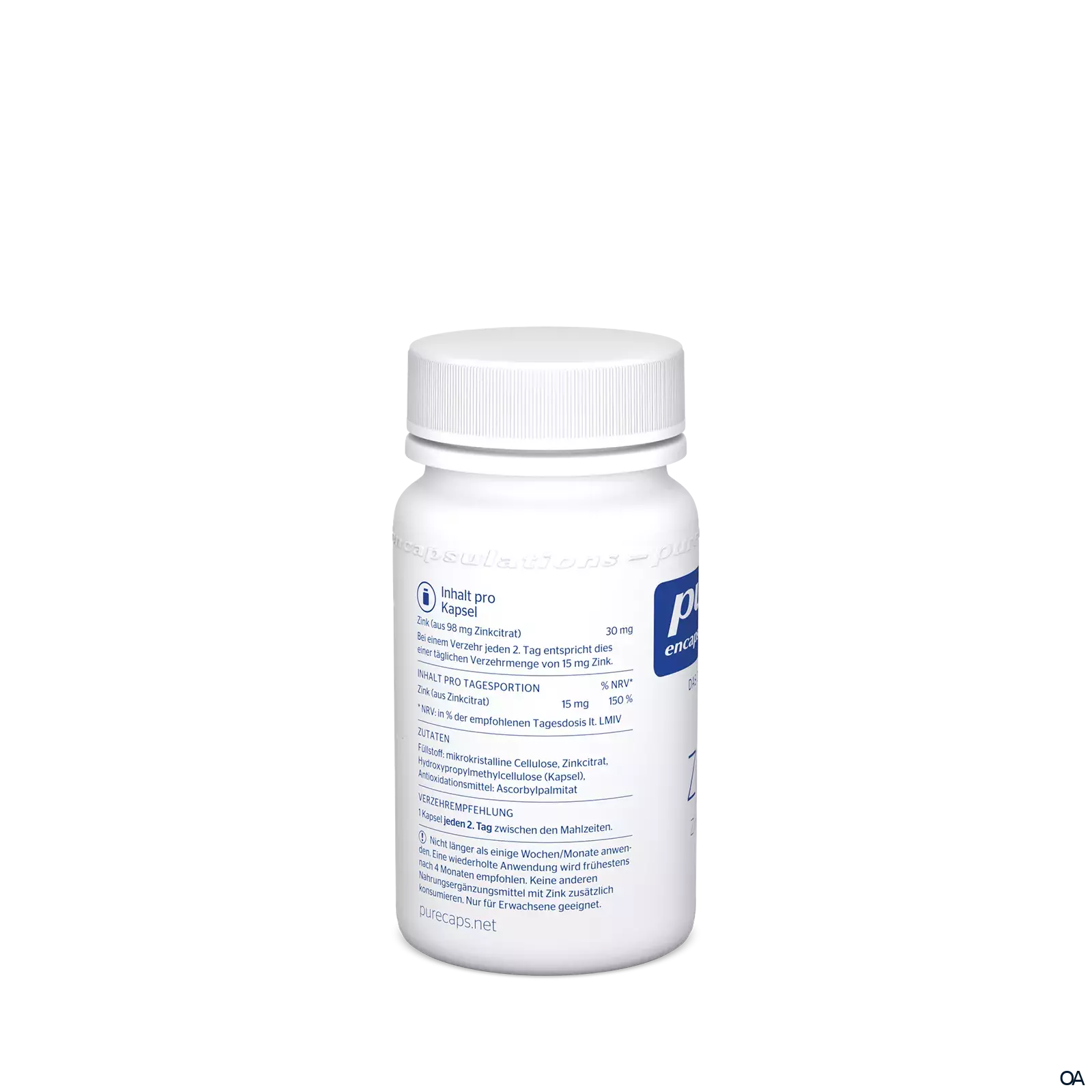 - Zusammensetzung pro Kapsel: Zink (aus 98 mg Zinkcitrat) 30 mg. Bei einem Verzehr jeden 2. Tag entspricht dies einer täglichen Verzehrmenge von 15 mg Zink.