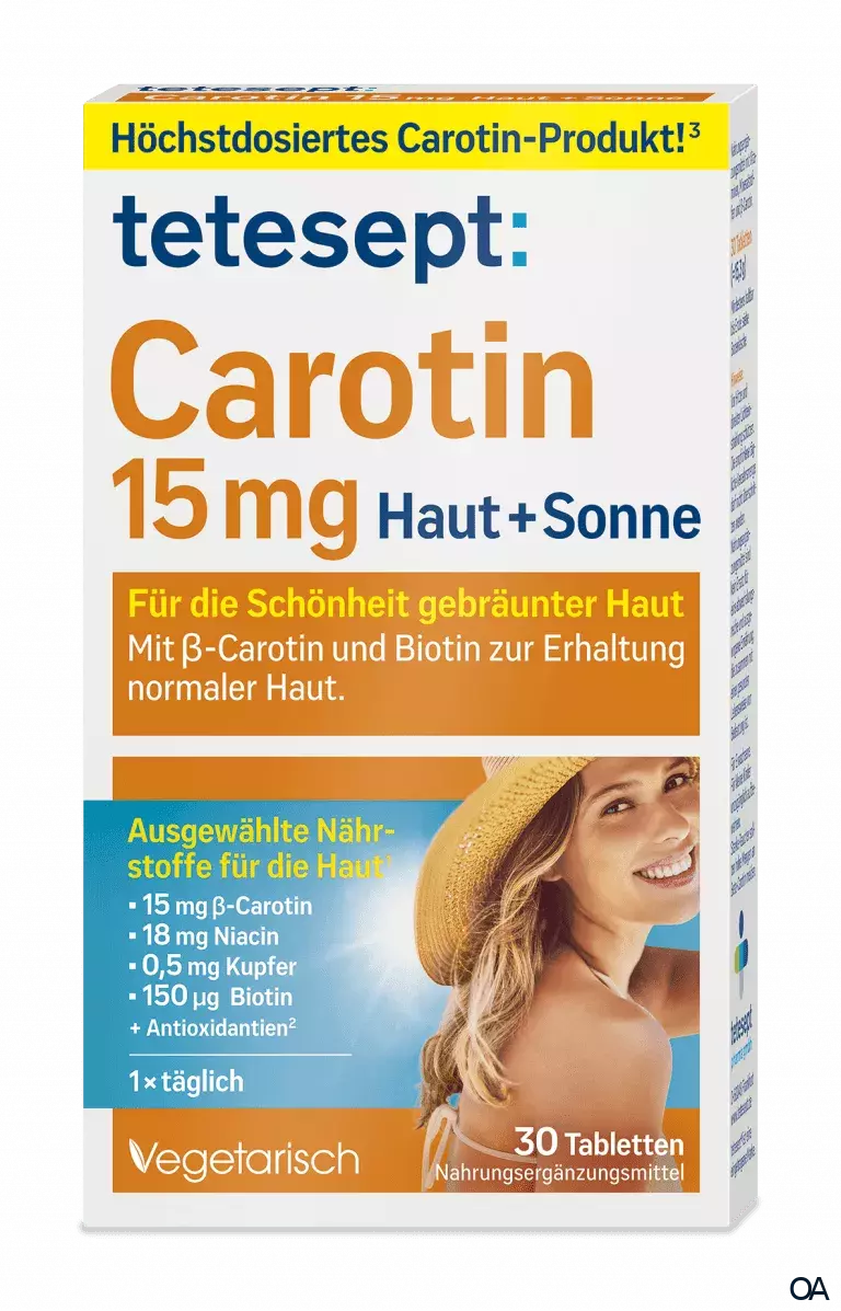 tetesept Carotin 15 mg Haut + Sonne Tabletten mit ß-Carotin zur Erhaltung normaler Haut. Für die Schönheit gebräunter Haut.