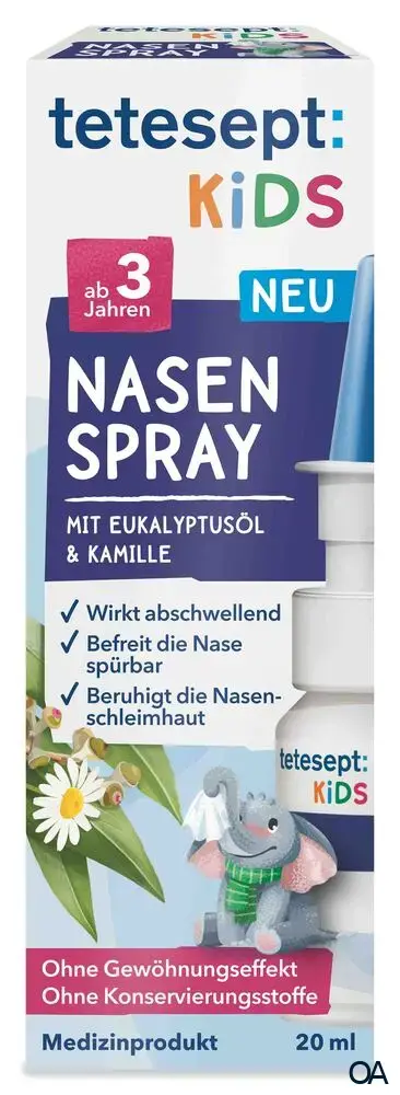 - Hinweise: tetesept Kids Nasen Spray darf nicht verwendet werden, • bei einer Überempfindlichkeit oder Allergie gegenüber Menthol, Pfefferminzöl, Eukalyptusöl, Kamillenöl, Salbeiöl, Thymianöl oder einem der sonstigen Be standteile von tetesept Kids Nasen Spray, bei Kindern unter 3 Jahren. In der Schwangerschaft & Stillzeit sollte tetesept Kids Nasen Spray nur nach Rücksprache mit dem Arzt/ der Ärztin angewendet werden. Bitte Gebrauchsinformation beachten.