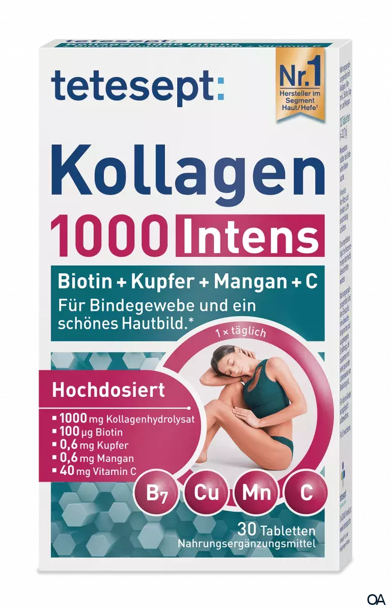 Kollagen ist das wichtigste Strukturprotein der Haut. Es befindet sich vor allem im Bindegewebe. Kollagen wird täglich neu gebildet, wobei die Fähigkeit der Haut zur Kollagenproduktion schon ab 30 Jahren stetig abnimmt. Eine regelmäßige Zufuhr von Vitaminen und Mineralstoffen kann helfen, die Haut von innen zu unterstützen. tetesept Kollagen 1000 Intens kombiniert 1000mg Kollagen mit essentiellen Vitaminen und Mineralstoffen für die Haut und das Bindegewebe.