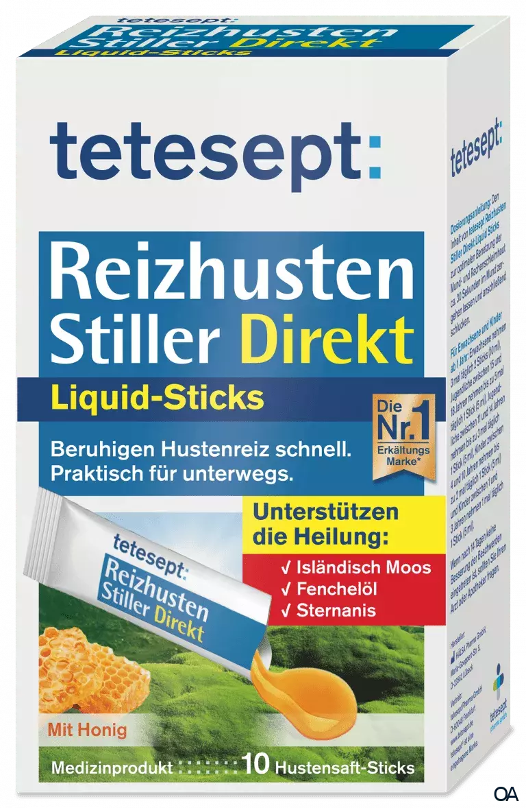 - Den Inhalt von tetesept Reizhusten Stiller Direkt Liquid Sticks zur optimalen Benetzung der Mund- und Rachenschleimhaut ca. 30 Sekunden im Mund zergehen lassen und anschließend schlucken.