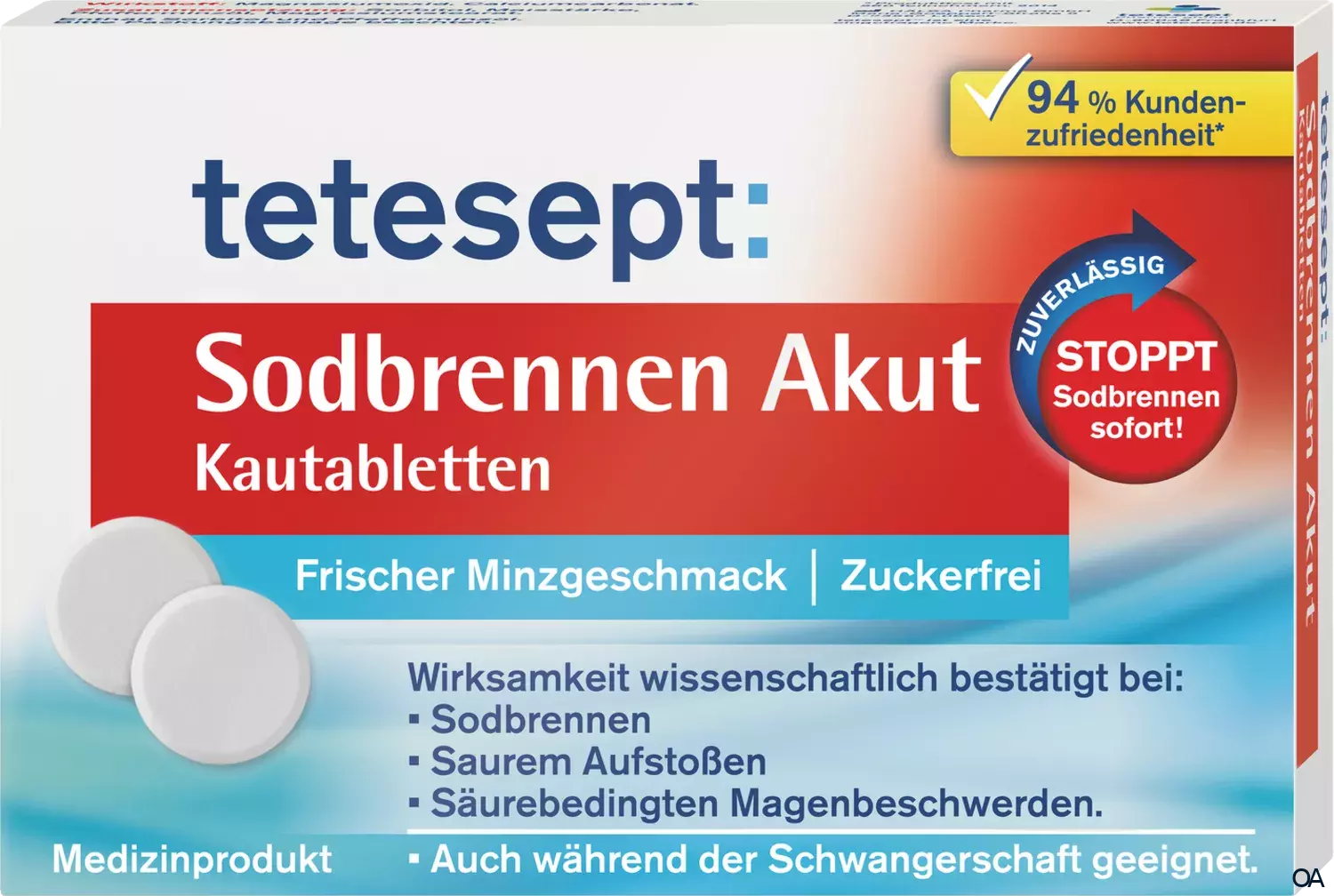 - tetesept Sodbrennen Akut Kautabletten werden vorzugsweise eine Stunde nach den Mahlzeiten, bei Bedarf auch vor dem Zubettgehen oder auch zwischendurch genommen. Die Kautablette kann gelutscht oder zerkaut werden.