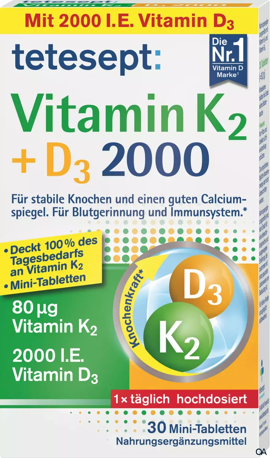 tetesept Vitamin K2+D3 2000 enthält 80μg Vitamin K2 in Kombination mit 2000 I.E. (= 50 μg) Vitamin D3 und trägt somit bei: