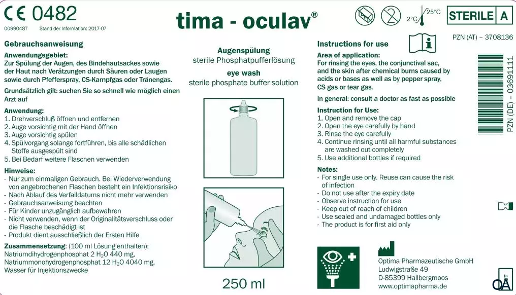 Die tima-oculav® Augenspülung ist eine sterile Phosphatpufferlösung für Augen und Haut. Zur Spülung der Augen, Bindehautsackes sowie der Haut nach Verätzungen durch Säuren und Lagen, sowie durch Pfefferspray, CS-Kampfgas oder Tränengas.